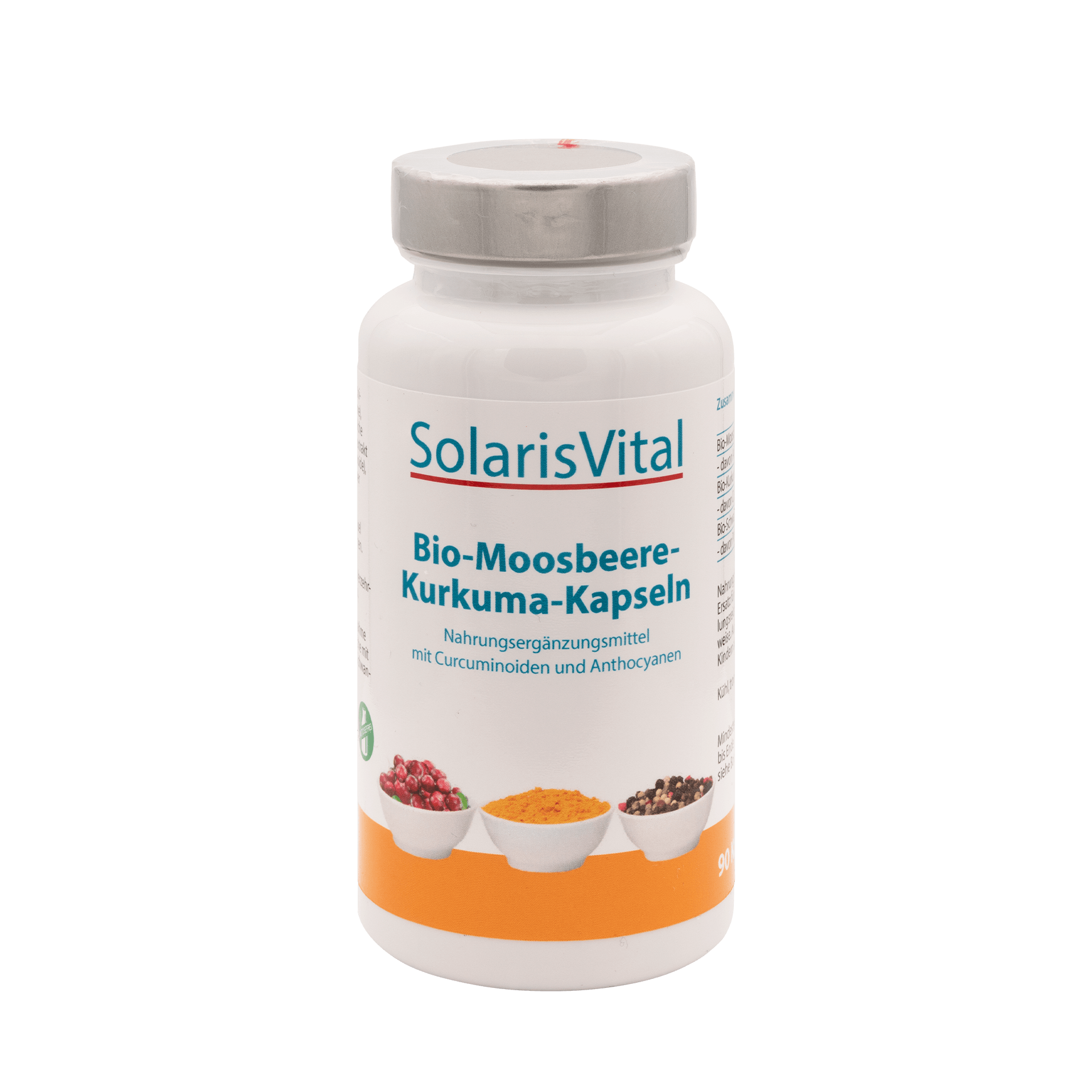 Die Bio-Moosbeeren-Kurkuma-Kapseln von SolarisVital enthalten Moosbeeren-Pulver sinnvoll kombiniert mit Kurkumawurzelstock-Extrakt und Piperin. Alle Inhaltsstoffe sind in Bio-Qualität. Die Herstellung der Kapseln erfolgt ohne den Zusatz von Farb- oder Süßstoffen. Da es sich um ein Bio-zertifiziertes Produkt handelt, können Sie sich sicher sein, dass kein Magnesiumstearat enthalten ist. Denn das ist Voraussetzung für die Bio-Zertifizierung. Die Curcuminoide des Kurkuma-Wurzelstock-Extraktes und die Anthocyane des Moosbeeren-Pulvers eignen sich hervorragend, um ihre tägliche Ernährung zu ergänzen.