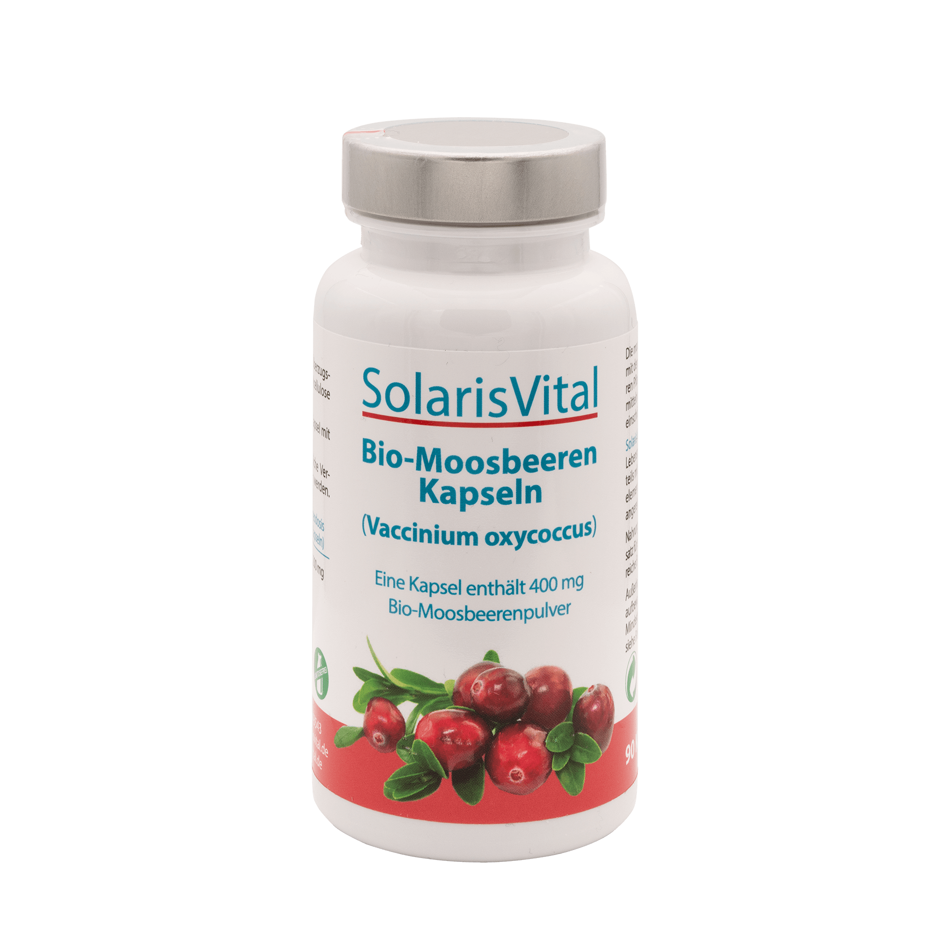 Die Bio-Moosbeeren-Kapseln von SolarisVital enthalten 100% reines Moosbeeren-Pulver in Bio-Qualität. Da es sich um ein Bio-zertifiziertes Produkt handelt, können sie sich sicher sein, dass kein Magnesiumstearat enthalten ist und die Herstellung der Kapseln ohne den Zusatz von Farb-, Konservierungs- oder Süßstoffen erfolgt. Denn das ist Voraussetzung für die Bio Zertifizierung. Moosbeeren schmecken sehr sauer bis bitter, weshalb manche Menschen den direkten Genuss des Moosbeeren-Saftes meiden. Die Moosbeeren-Kapseln bieten eine praktische und geschmacksneutrale Alternative zum Saft oder Konzentrat.