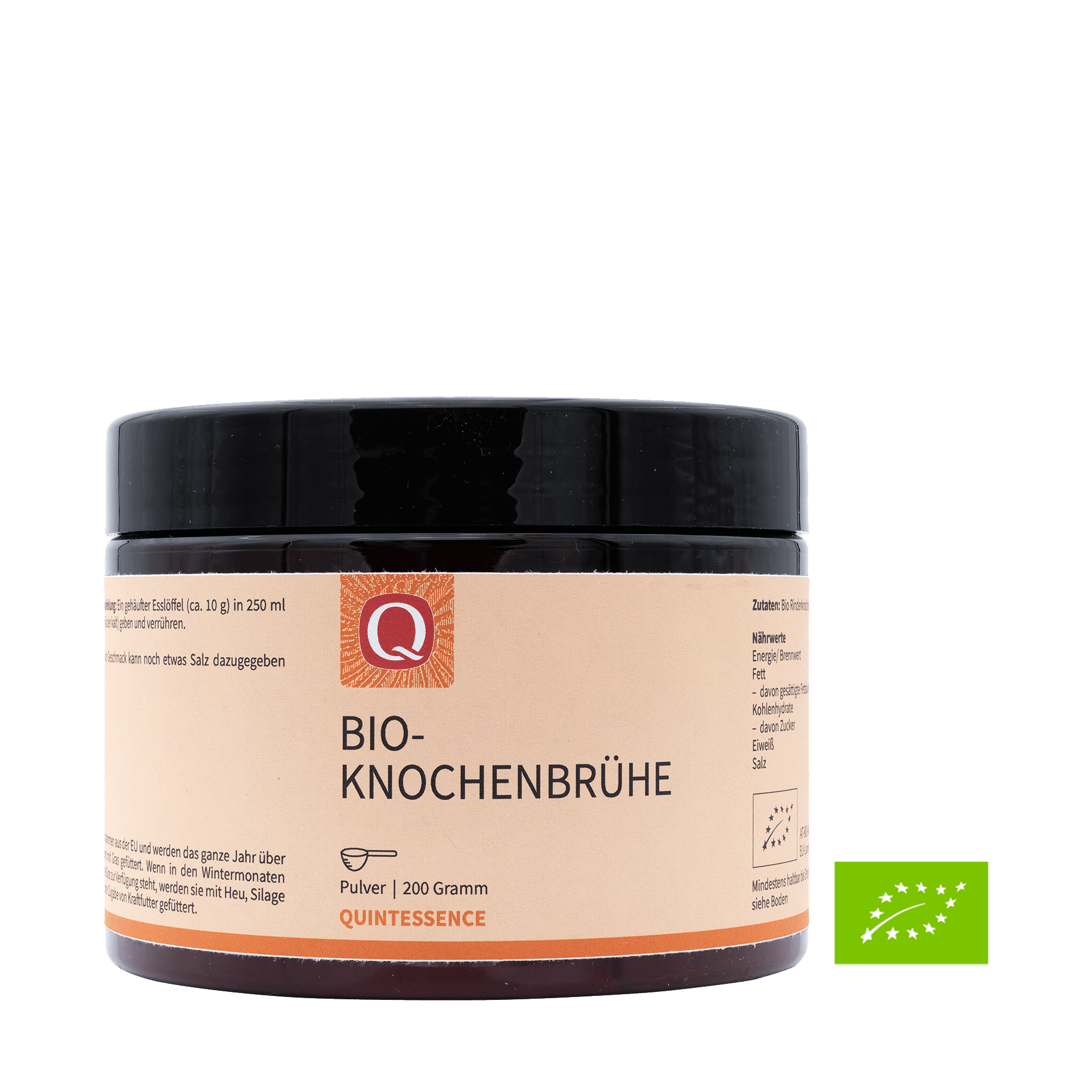 Genieße die proteinreiche Bio-Knochenbrühe von Quintessence aus artgerechter, biologischer Rinderhaltung. Die Rinder werden ganzjährig mit Gras, Silage und Heu gefüttert. Jedes Glas enthält 200 g reines Rinderknochenbrühe Pulver, das schonend verarbeitet wurde, um die wertvollen Nährstoffe bestmöglich zu erhalten.
