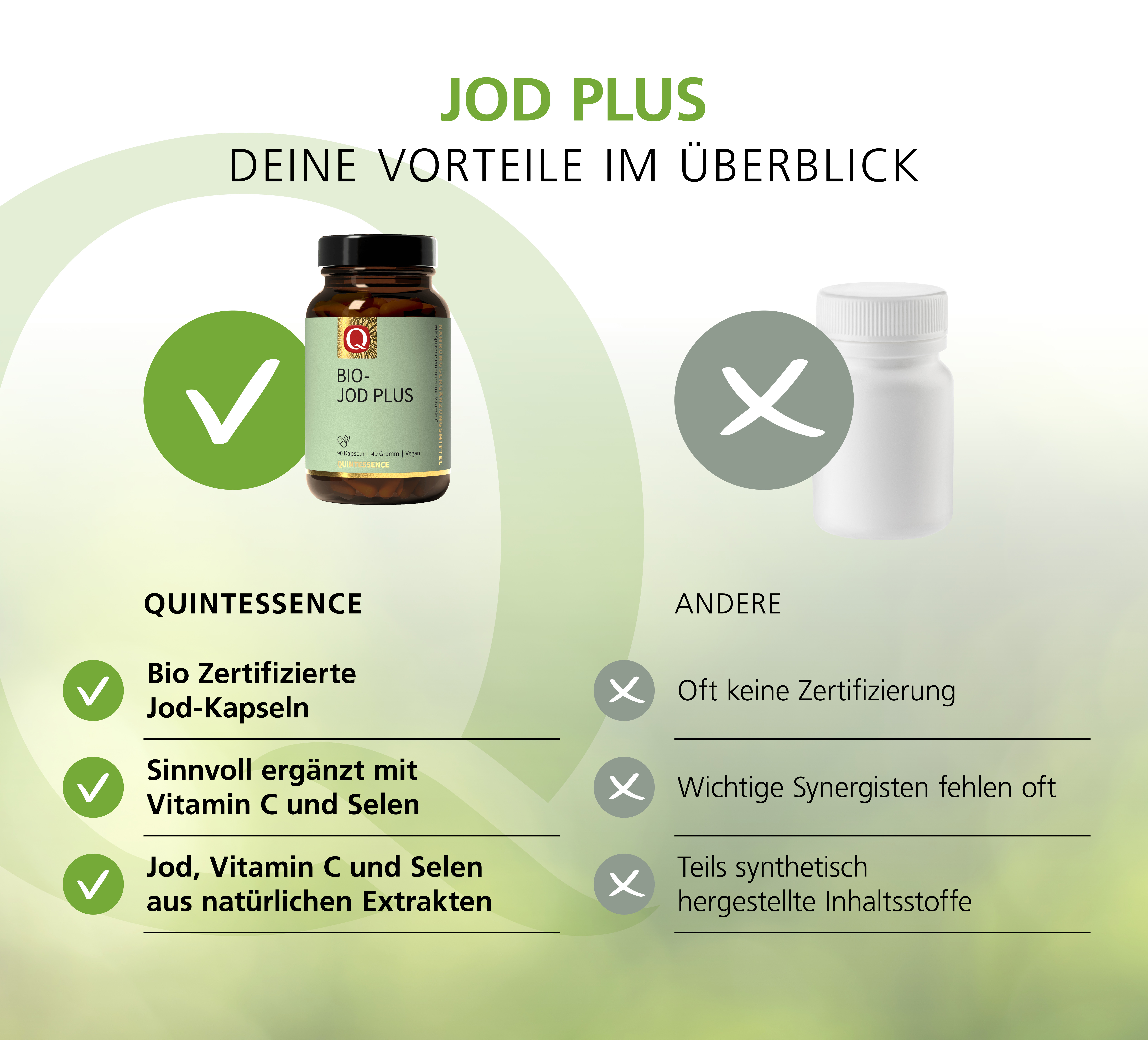 Du möchtest deine Schilddrüse1 gezielt mit natürlichem Jod und Selen unterstützen? Dann lerne jetzt unsere Jod Plus Kapseln kennen. Sie enthalten nur natürliche Inhaltsstoffe, sind rein pflanzlich und Bio zertifiziert. Das Jod stammt aus der Meeresbraunalge Ascophyllum nodosum, Selen aus Sonnenblumensamen sowie Basilikum und Vitamin C aus der Acerola Kirsche.