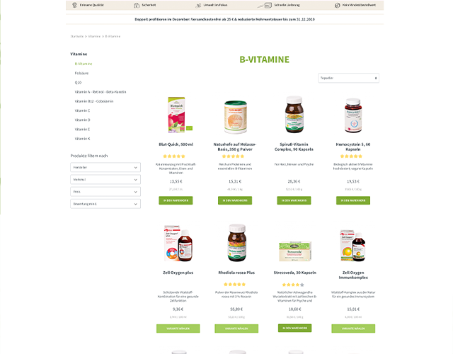 In unseren Kategorien finden Sie nun neben jeder Produktliste ausführliche Filtermöglichkeiten. Hier können Sie die angezeigten Produkte nach bestimmten Kriterien filtern. Wählen Sie beispielsweise bestimmte Hersteller aus, deren Produkte Sie angezeigt bekommen möchten. Sie können die Produkte auch nach Merkmalen wie Bioqualität, Glutenfrei oder Vegan filtern.