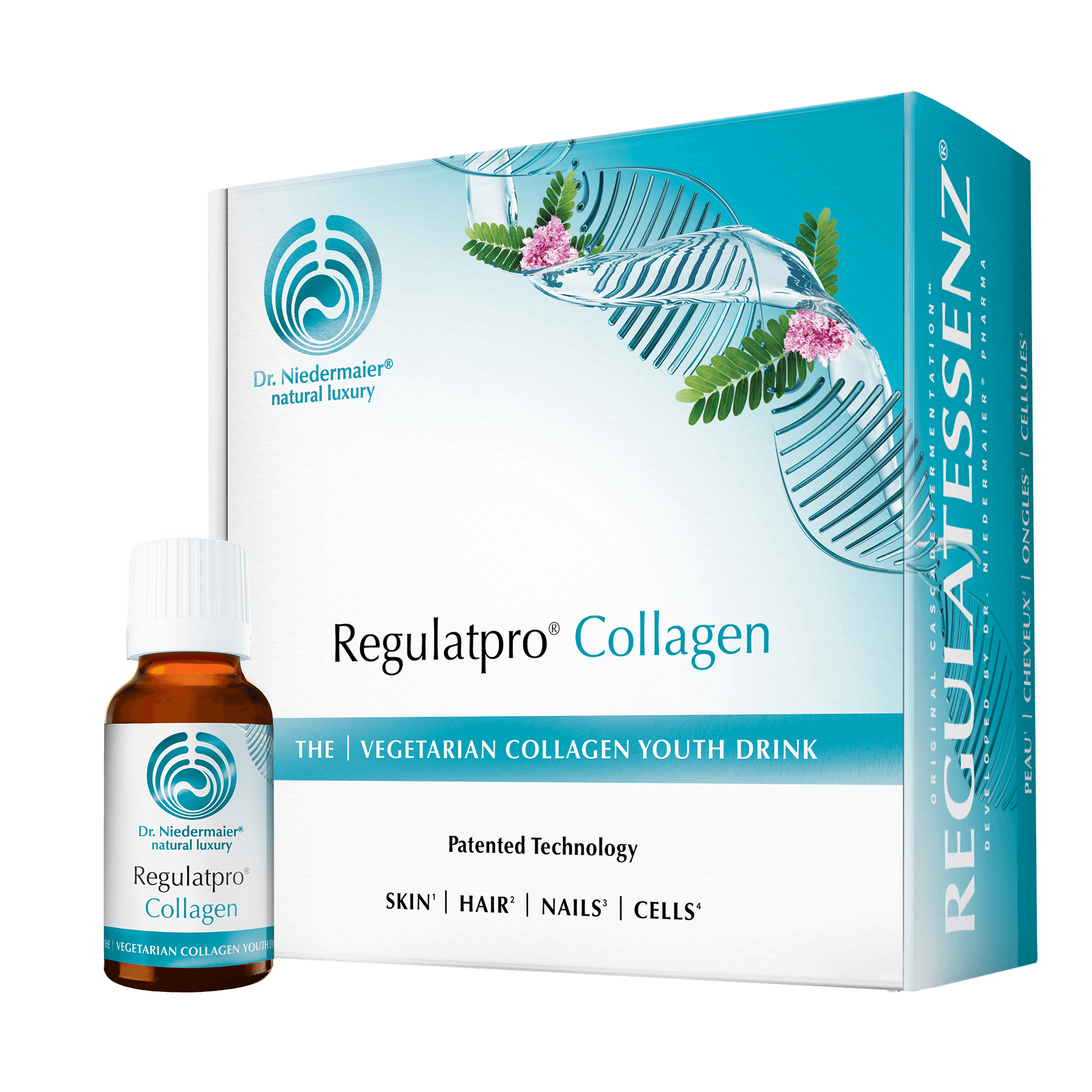 Nach jahrelanger Forschung und Entwicklung hat es Dr. Niedermaier® Pharma geschafft, den begehrten Anti-Aging-Stoff „Kollagen“ in vegetarischer Form in einem neuen Beauty-Drink zu integrieren. Dieses flüssige Nahrungsergänzungsmittel kombiniert fermentierte Regulatessenz® mit Kollagen aus Eierschalenmembran, veganer Hyaluronsäure sowie sorgfältig ausgewählten Vitaminen und Mineralstoffen. Der Regulatpro® Collagen Drink vereint die Schätze der Natur zu einem natürlichen Anti-Aging-Mittel.1-7