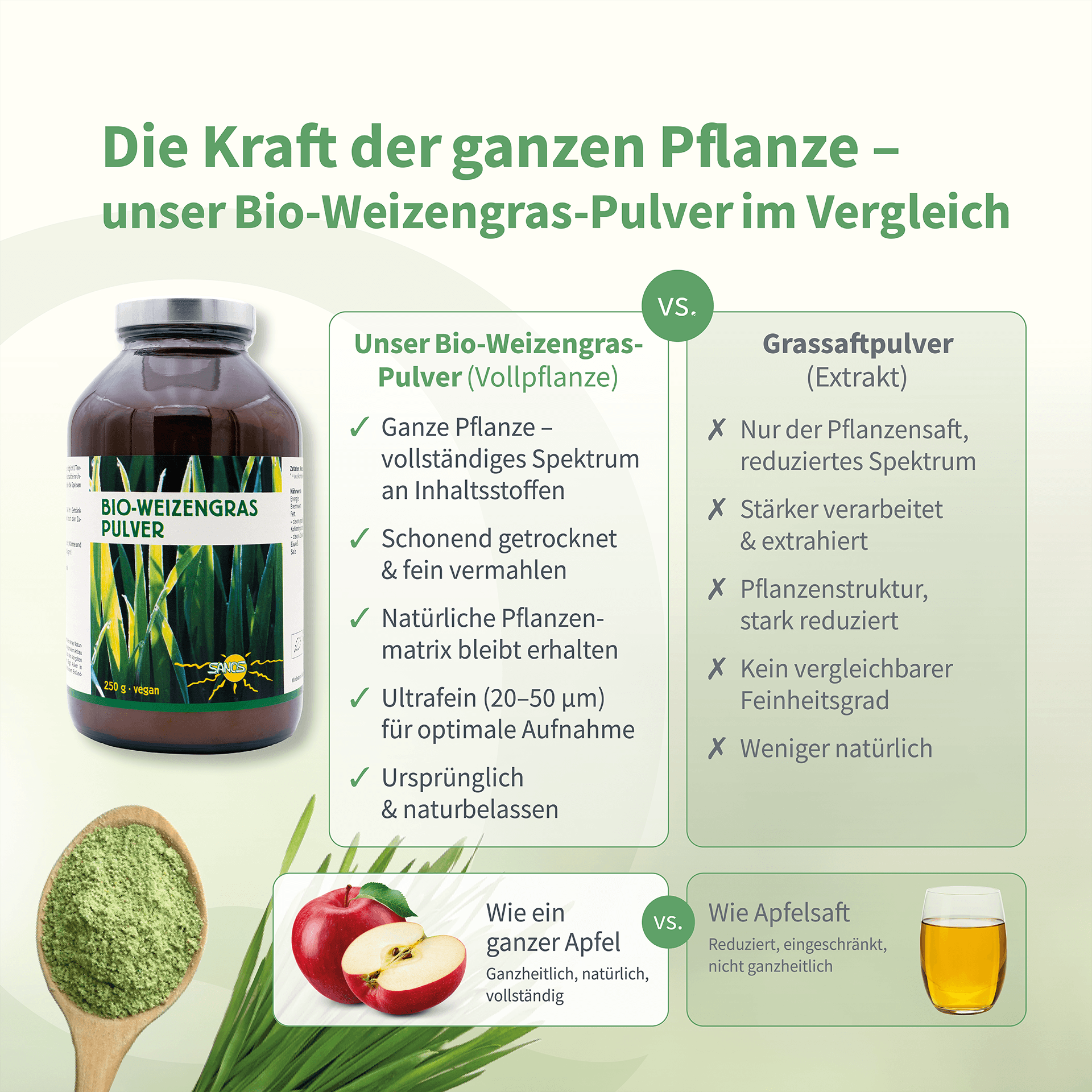 Im Unterschied zu Grassaftpulver handelt es sich bei unserem Produkt um ein Vollpflanzenpulver. Das bedeutet: Das gesamte Blatt wird schonend getrocknet und vermahlen – ohne den Umweg über eine Saftextraktion. Dadurch bleibt das natürliche Spektrum der Pflanze erhalten. Daher ist Weizengraspulver ursprünglicher und natürlicher als Pulver aus Weizengrassaft. Ein anschaulicher Vergleich: Wie beim Unterschied zwischen einem ganzen Apfel und Apfelsaft bleibt beim Pulver die gesamte Pflanzenstruktur erhalten.